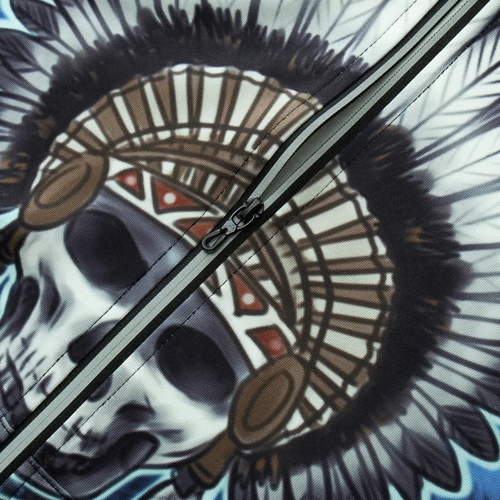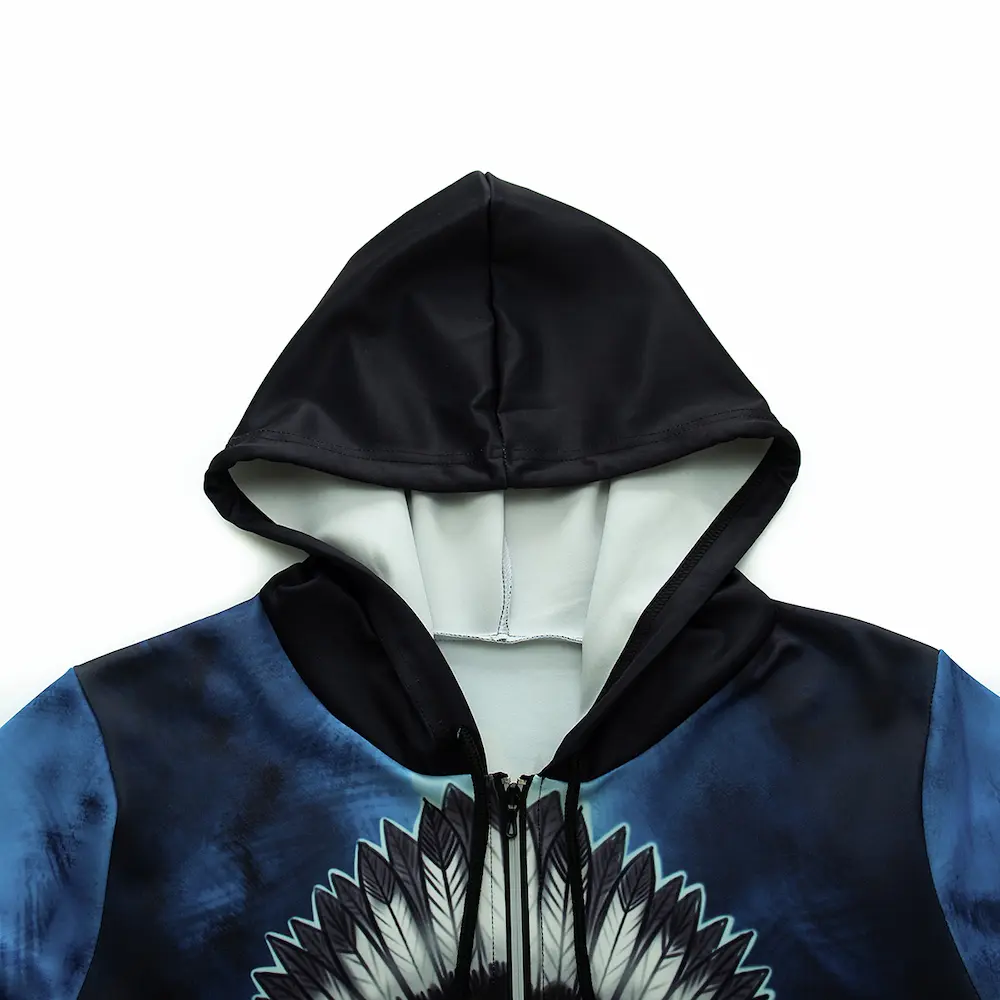 Худі дитяче Iron Spirit різних відтінків синього та блакитного кольорів із зображенням індіанця на спині та черепом в індіанському роучі з пір’ям на грудях. З капюшоном та двома кишенями з боків