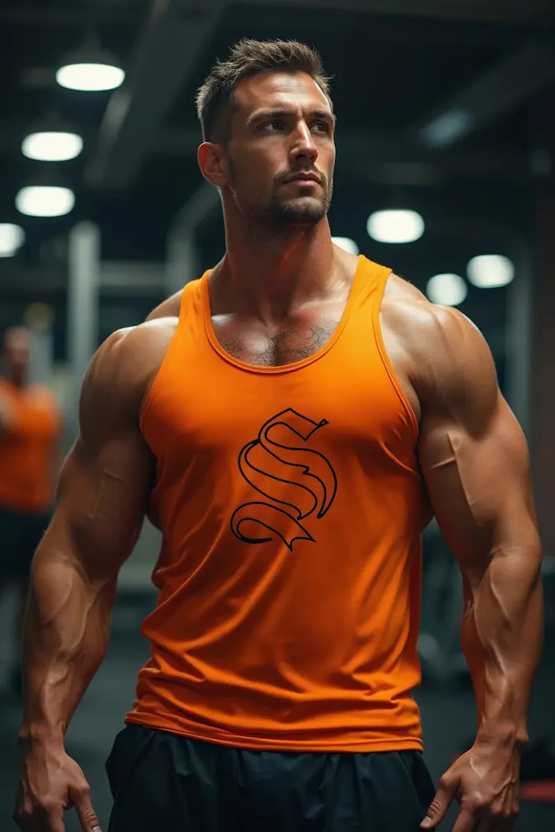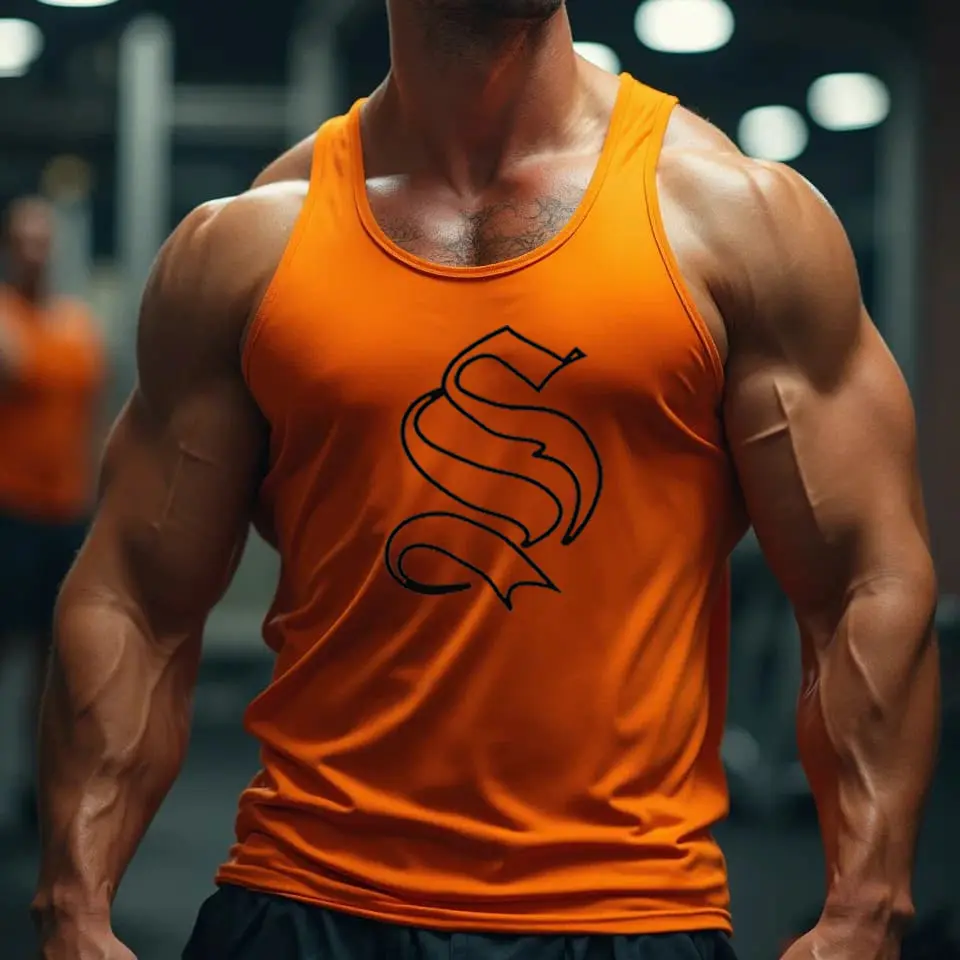 Майка чоловіча спортивна помаранчева Hybrid з чорним логотипом поєднує стиль і комфорт, ідеально підходить для тренувань та активного способу життя. Виготовлена з натуральної бавовни із додаванням спандексу, вона забезпечує свободу рухів та приємні відчуття на шкірі.