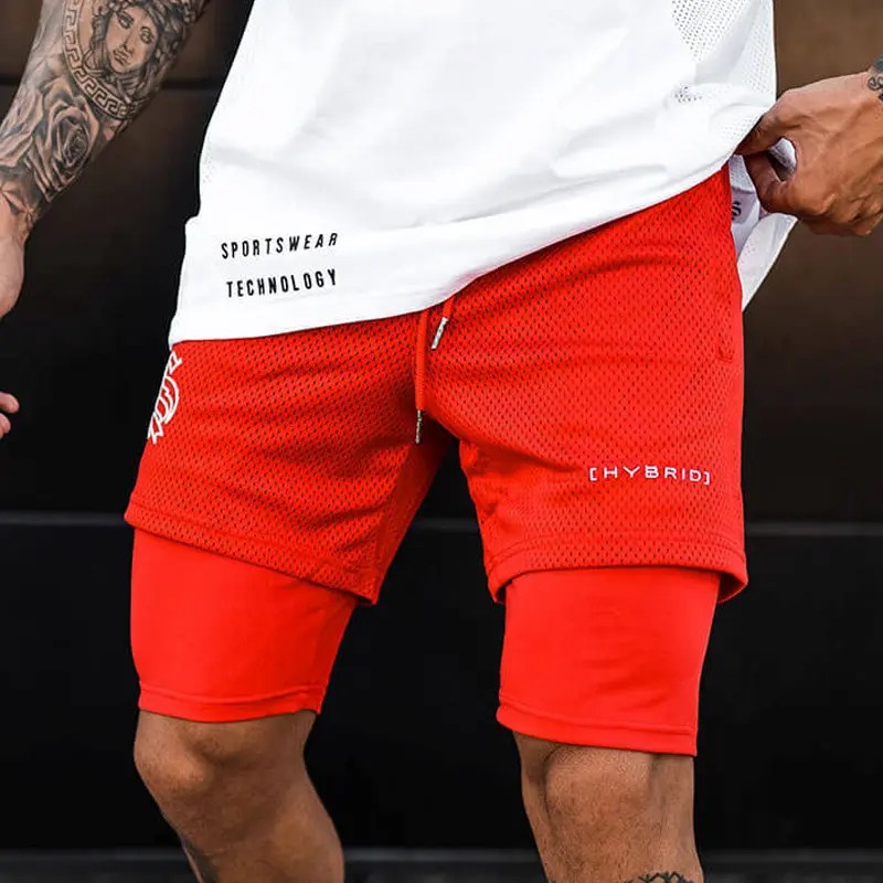Шорти спортивні чоловічі двошарові HYBRID червоні – ідеальне поєднання стилю, комфорту та функціональності. Ці двошарові шорти розроблені для активних чоловіків, які цінують високу якість і зручність під час тренувань. Верхня частина виконана з перфорованої тканини, що забезпечує відмінну вентиляцію, а внутрішній шар з облягаючої тканини гарантує підтримку і комфорт.