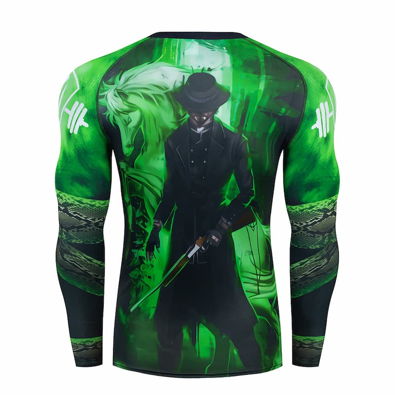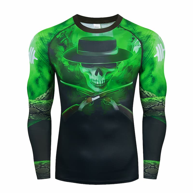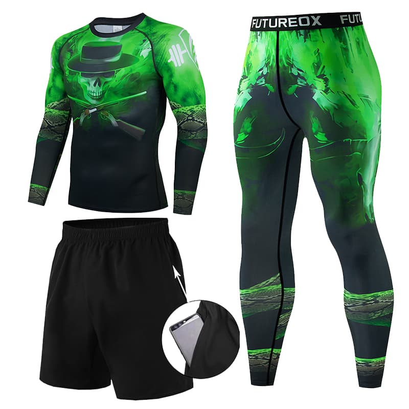 Рашгард та тайтси чорного та різних відтінків зеленого кольору із зображенням черепа у капелюсі на грудях та зміїної шкіри на рукавах. Шорти чорного кольору. Тайтси з широкою чорною гумкою на поясі Костюм спортивний Green Snake розроблений із застосуванням інноваційних технологій для максимального комфорту та ефективності під час тренувань. Костюм ідеально підходить для занять бігом, фітнесом, йогою, кросфітом, єдиноборствами та іншими видами спорту.