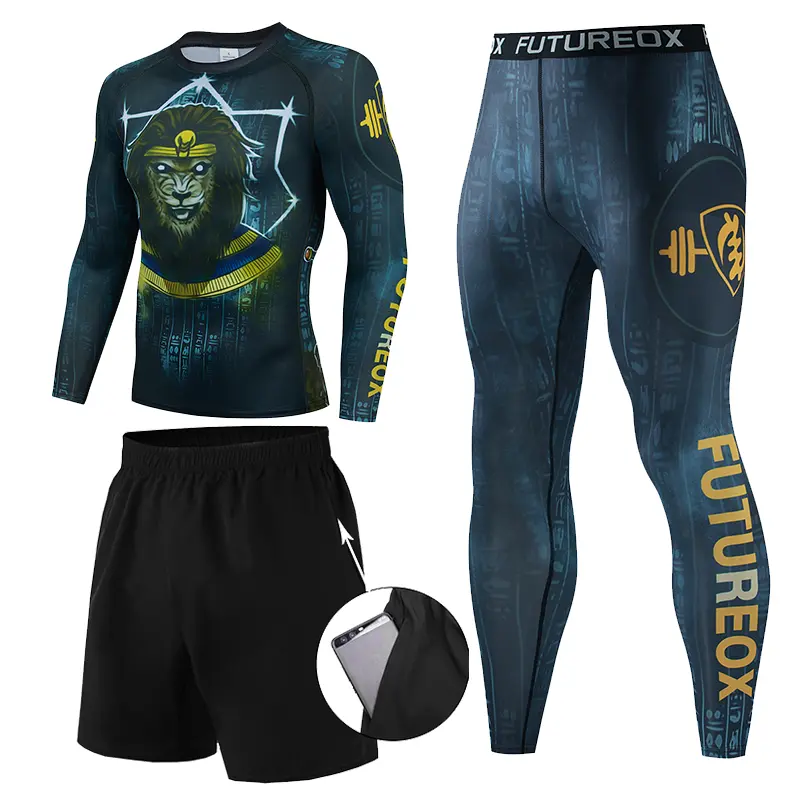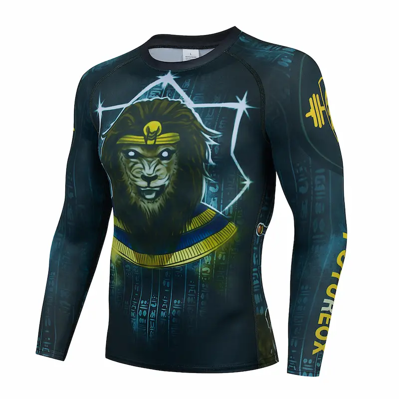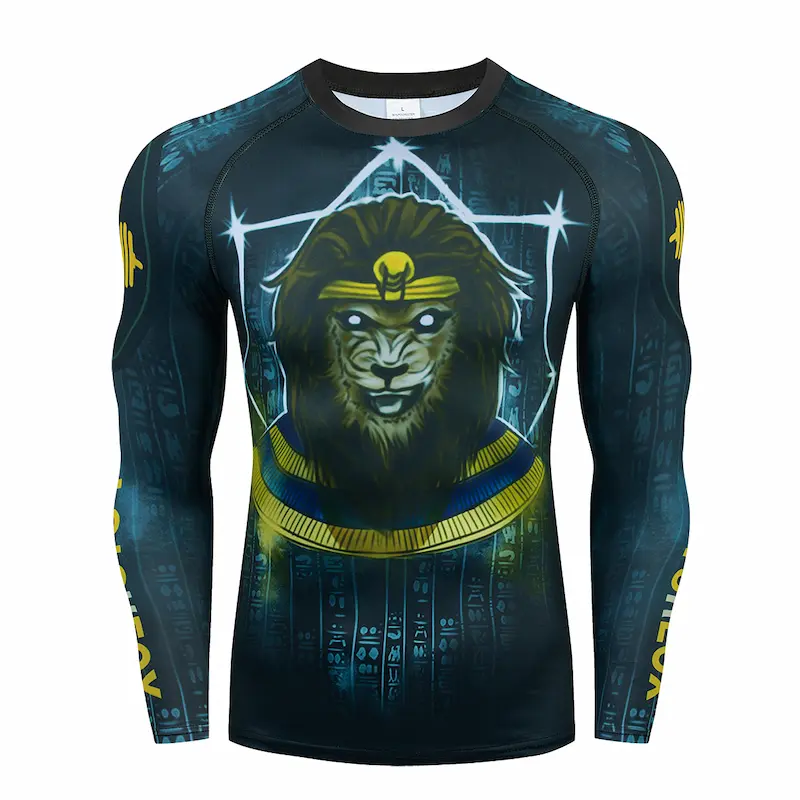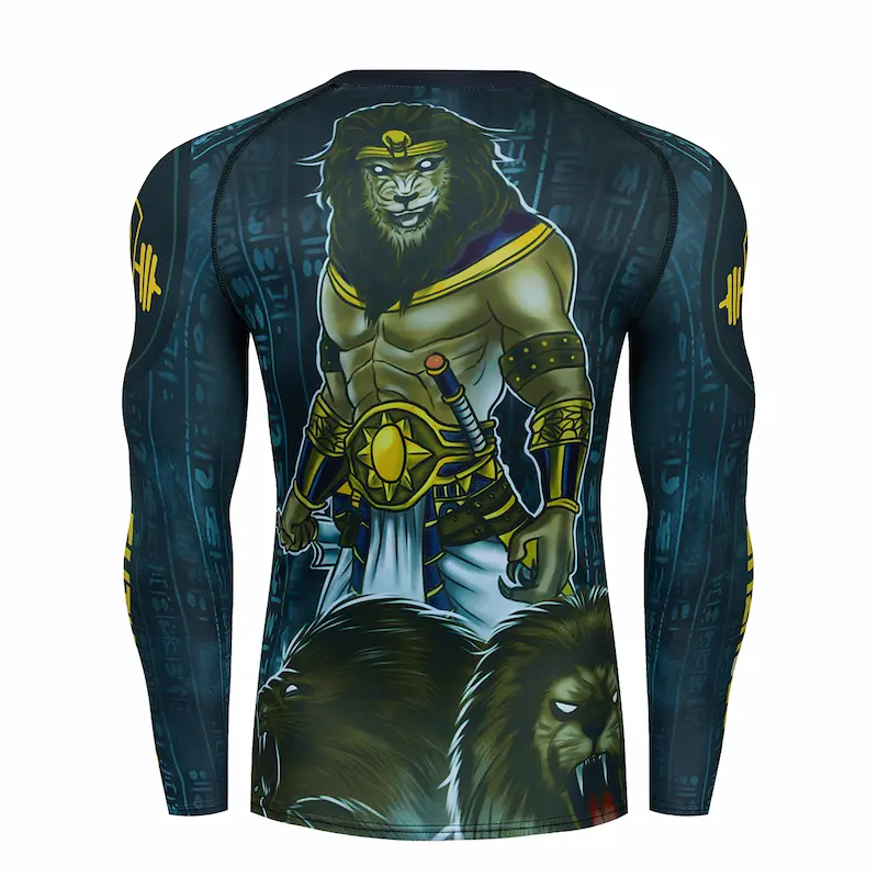 Рашгард і тайтси різних відтінків синього та лілового кольорів із зображенням лева-фараона на спині та грудях. Шорти чорного кольору. Тайтси з широкою чорною резинкою на поясі. Костюм дитячий Lion King шиється зі швидковисихаючої компресійної тканини. До комплекту входять шорти, штани та рашгард.