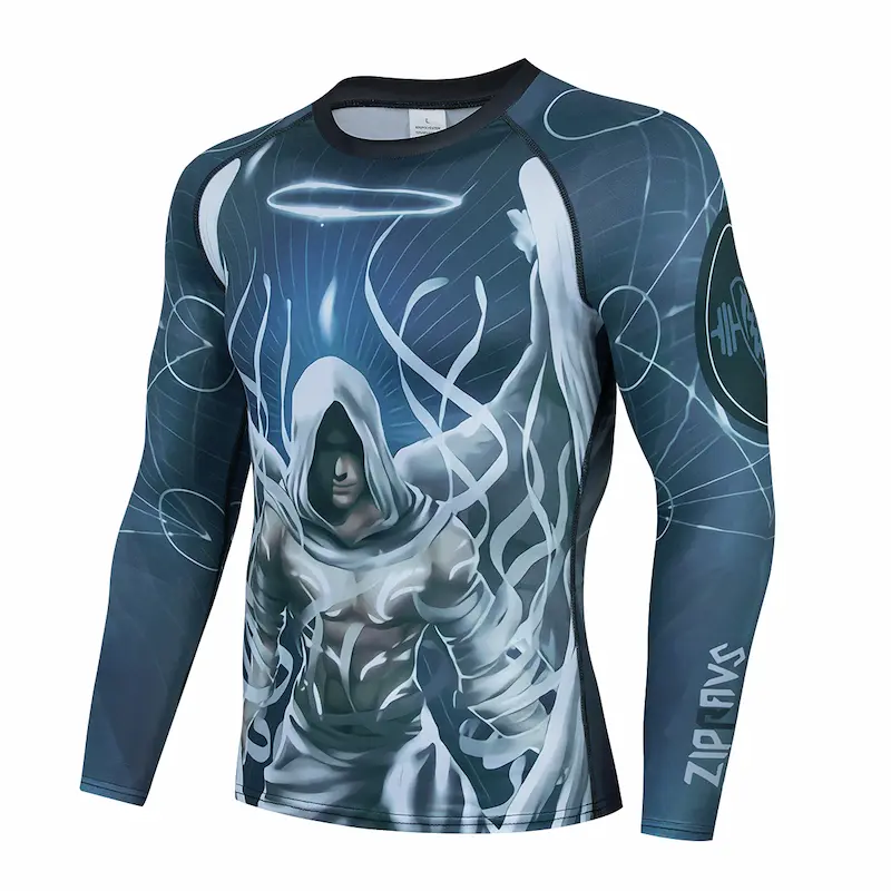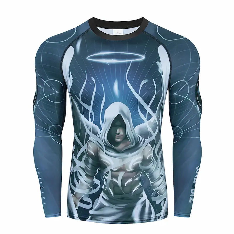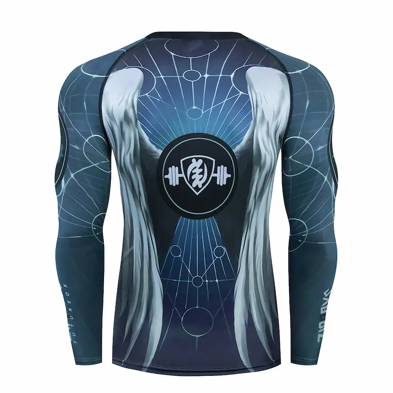Рашгард і тайтси різних відтінків сірого та фіолетового кольорів із зображенням білого ангела з крилами на спині та грудях. Шорти чорного кольору. Тайтси з широкою чорною гумкою на поясі. Костюм спортивний White Angel розроблений із застосуванням інноваційних технологій для максимального комфорту та ефективності під час тренувань. Костюм ідеально підходить для занять бігом, фітнесом, йогою, кросфітом, єдиноборствами та іншими видами спорту.